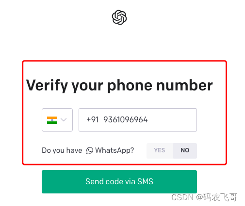 购买成功之后点击复制,将手机号复制到前面验证手机号的框框中,需要删除前数字91。接着点击Send code via SMS 按钮发送短信。
