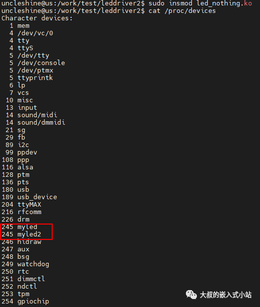 编译后insmod装载驱动,cat /proc/devices查看一下