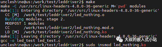 文件传入linux系统,make命令编译,insmod命令加载驱动: