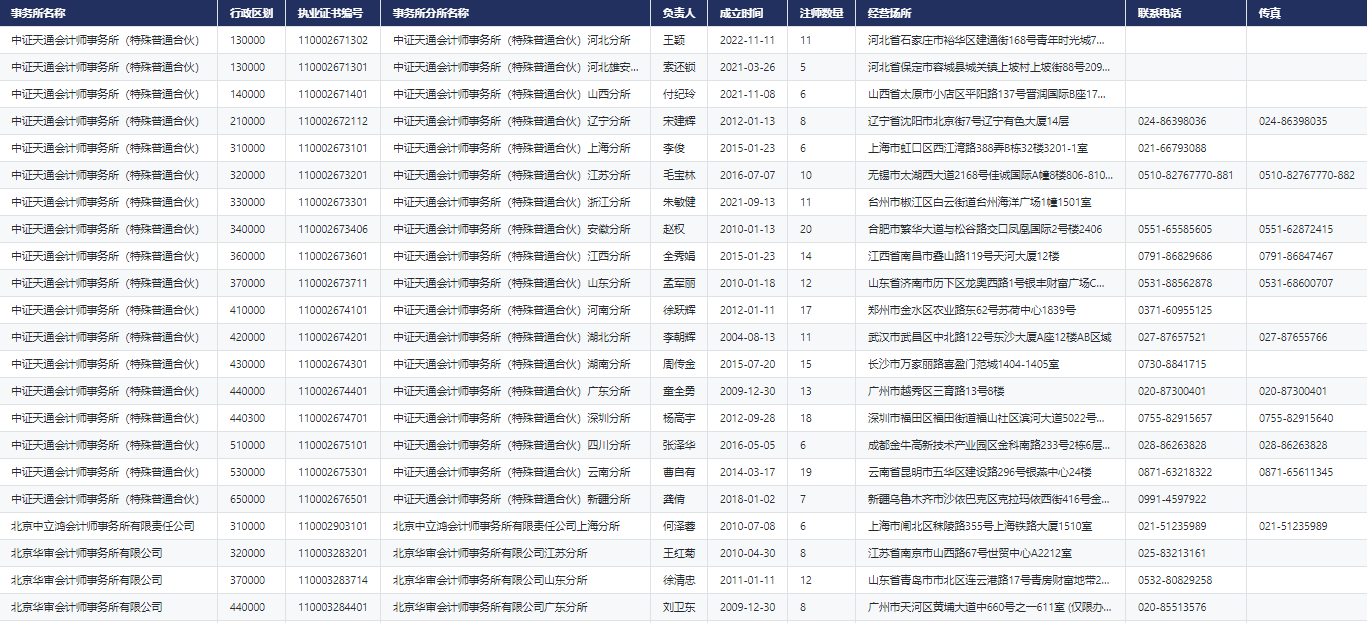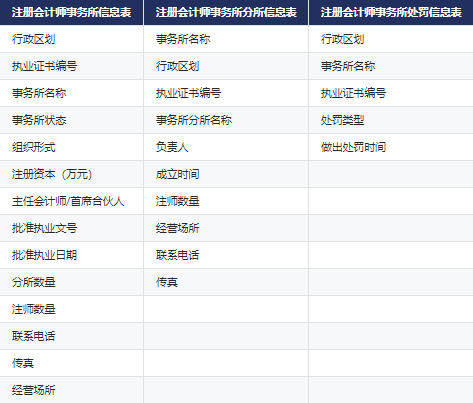 CnOpenData整理注册会计师及事务所信息,覆盖注册会计师、事务所分所、事务所处罚等多个信息,囊括:事务所名称、批准执业文号、执业证书编号、行政区划、成立时间、处罚类型、注师数量等字段内容,为相关研究提供数据助力。